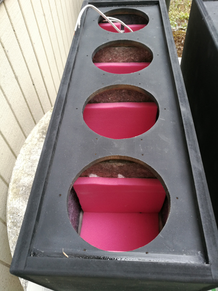 The inside of the woofer cabinet has several layers of acoustic damping materials glued in place tight to the surfaces, to minimize any potential resonances, and to reduce cabinet radiation of said resonance's. There's 3/8 inch thick wool felt, then foam rubber, then more. Foam rubber works great at higher frequencies, but doesn't have the mass to be very effective at the lower frequencies, unless it's glued tightly to the inside surfaces of the enclosure. The wool felt is probably more effective due to it's higher mass, but working together in layers seems better. The idea is to dissipate all the internal acoustic energy, so it won't bounce around and re-emerge through the diaphragms with the various resonant qualities. Cabinet radiation is usually arguably small, but because of the large surface area of the cabinet, it's considered significant.