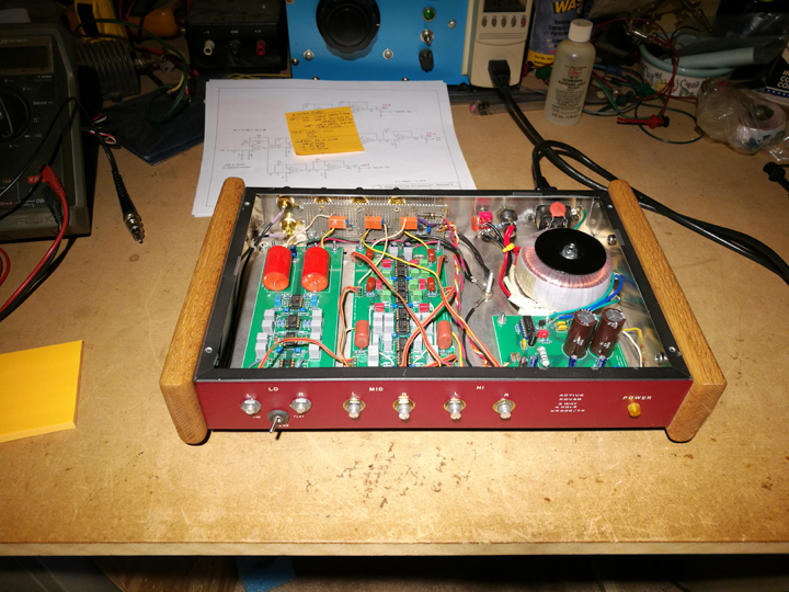My version is tri-amped with a 24dB/oct Linkwitz-Riley active crossover network, and has active EQ (bypassable) to make the low bass acoustically relatively flat down to 30HZ.
