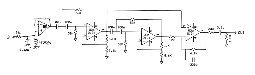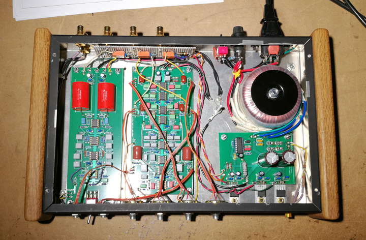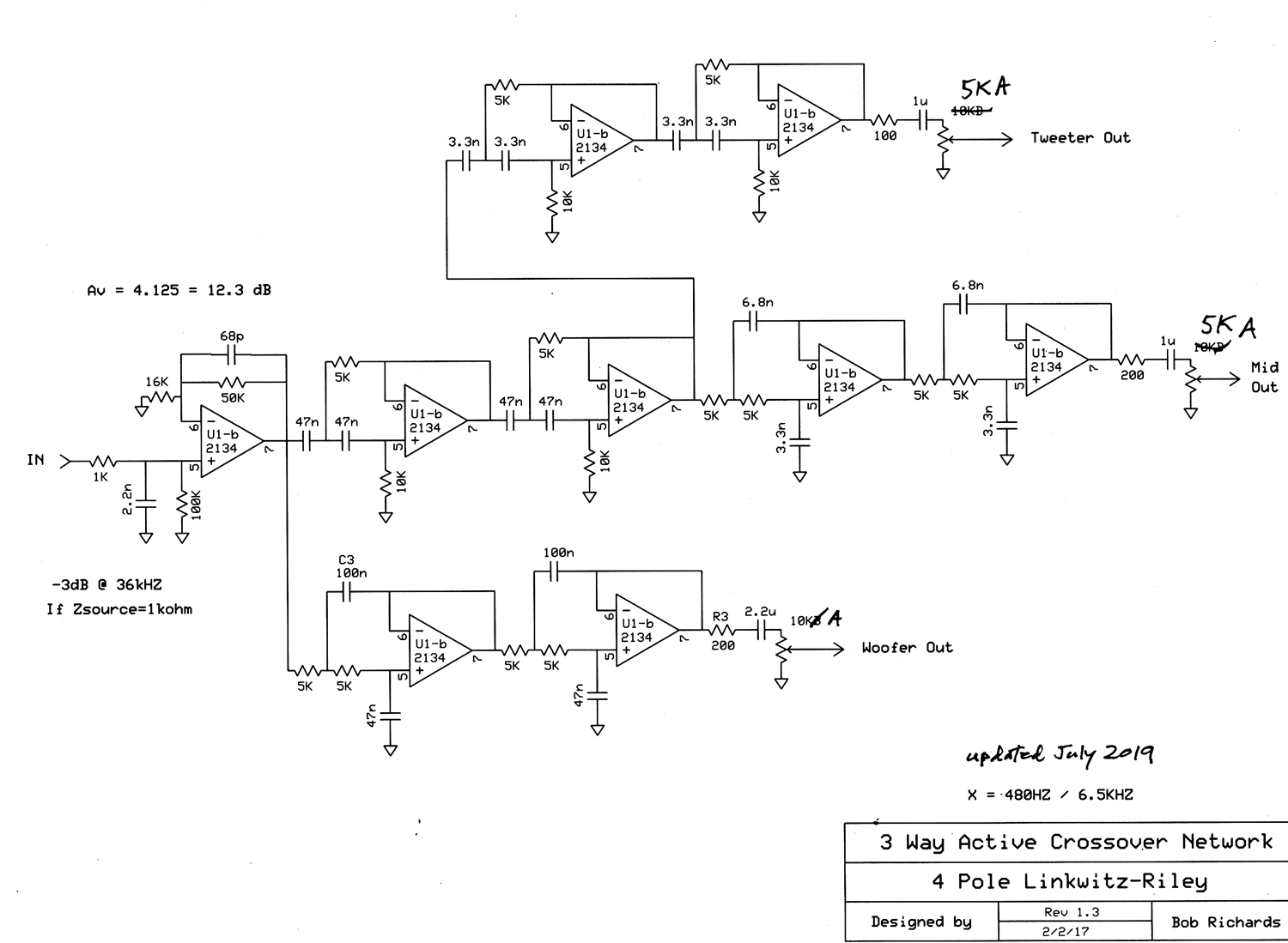 Above is the crossover circuit. Putting pots at the outputs is risky (would enable high frequency rolloff if cables were long), but fewer opamps is usually a good thing (less hiss noise - although this is not a problem at all in this system). Because the dynamic range of the circuit with +/- 15VDC power supply is WAY bigger than the needed signal size (to overdrive any poweramp), I put a gain of 12dB in front of it, and reduced the outputs with the individual level controls, thereby pushing the noise floor of this circuit down significantly. There's also a passive Rf filter at the input, to reduce any supersonic noise coming from anything (digital audio source?), which could cause slewing related distortions.