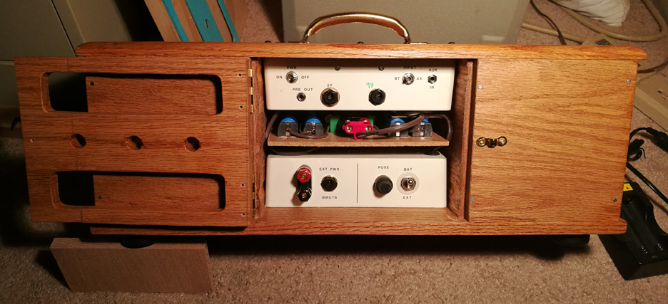 I did a bunch of research on the web, and became convinced that all boomboxes available to buy are designed to break in about a year. Some sounded pretty good, but in the end I decided that it would be interesting to learn first hand about switch mode poweramps, Lithium and/or Lead Acid batteries, and to have a good sounding wireless boombox for any future campouts or picnics. Much like with my guitar amp projects, I couldn't find anything out there I liked enough, so I built one myself.