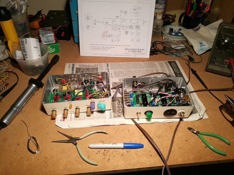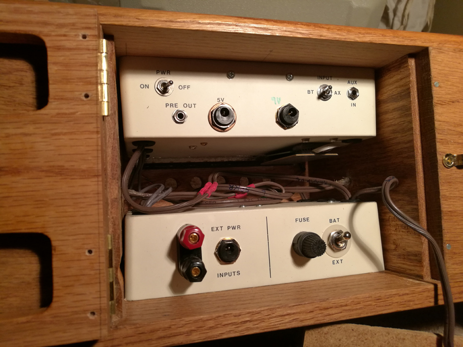 Above you can see the Bluetooth receiver board velcroed to the bottom of the preamp box. The brown wires are for speaker and power supply hookups. Preamp outputs feed poweramps thru shielded cables (gray).