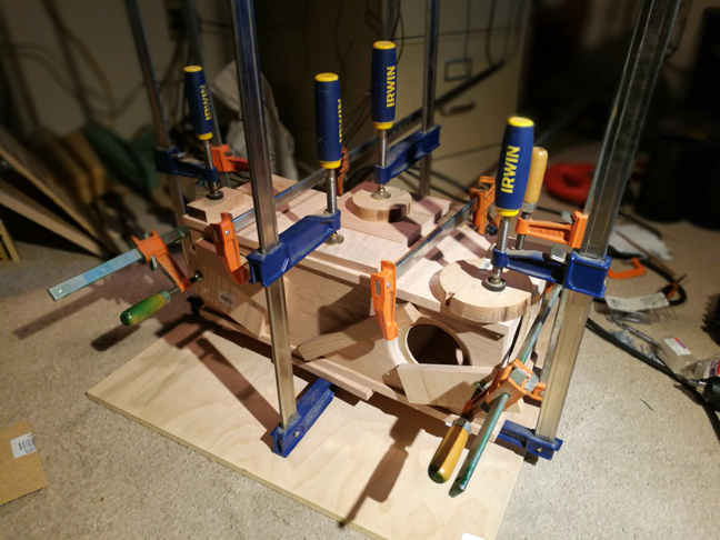 And here's the cabinet being built. All 1/2 inch red oak, except for the masonite speaker subpanels and the battery board.