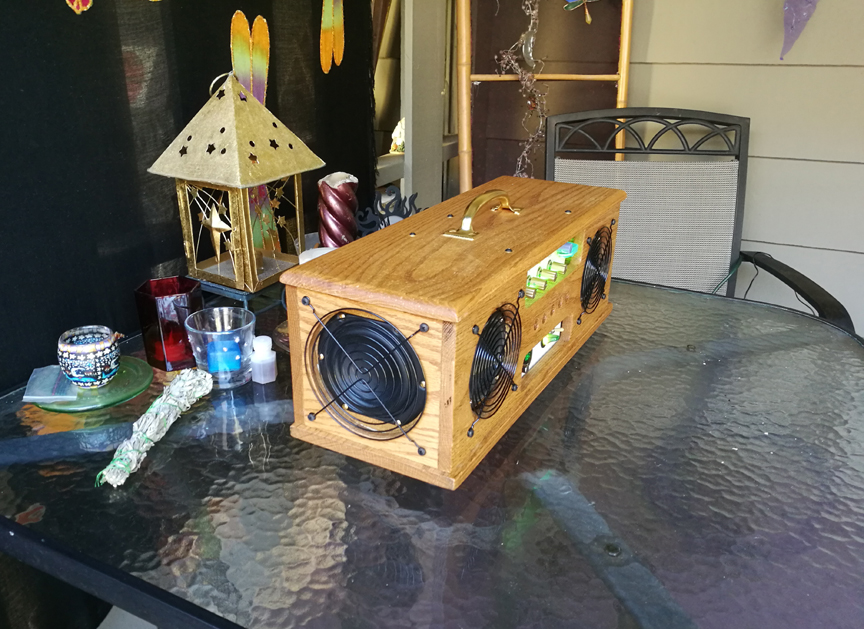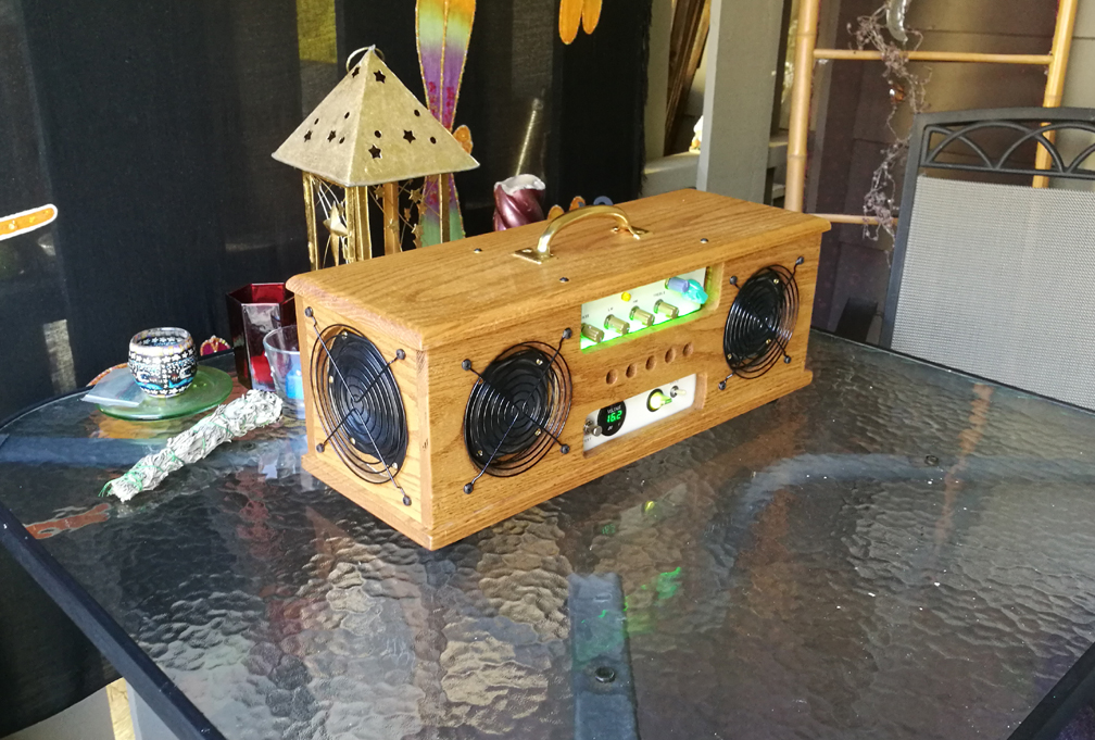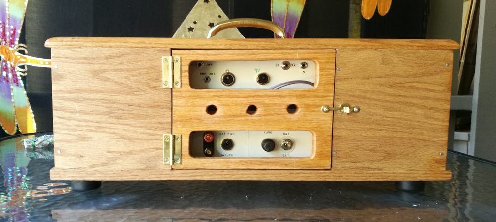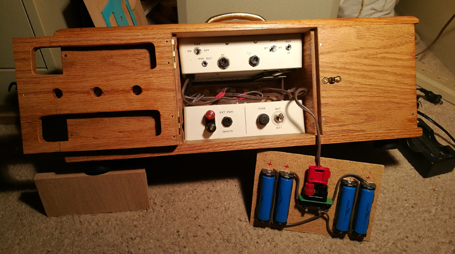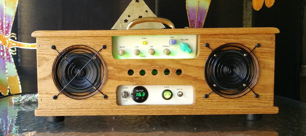 Here it is a week later, with front panel cutouts and wood stain on. The row of 1/2 inch holes are for ventilation. The Lithium batteries will be right behind them.