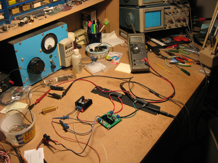 I was also testing a switch-mode voltage booster from Parts Express (the small red board on the left w. heatsinks), which worked pretty well. I was going to use it when I was going to use the lead-acid 12 volt battery, to get the DC up to around 20 volts, but have since decided not to.