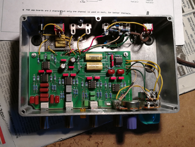 When I first hooked it all up and tested it, it had "motorboat" oscillations when preamp gain was maxed and a signal was present. This was due to the many high pass capacitors in the circuit each contributing phaseshift at the lowest frequencies.