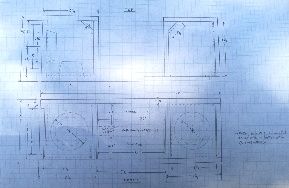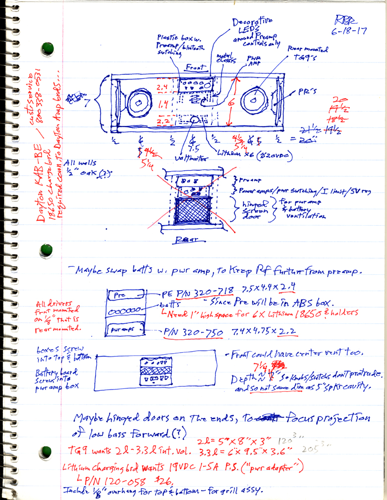 I like to brainstorm my thoughts onto paper, and then think about how they could be better suited for the real world situation. There's actually a lot to consider if you want to get it right. How big and heavy do I want it to be? How would I recharge the Lithium batteries without causing an explosion? How much bass do I want to have; knowing that it's hard to get much low bass out of a speaker outdoors without significant power and cone surface area? Are the little tiny heat sinks on the poweramp boards going to be enough when sunlight could be hitting the box? Should the box be painted white to keep cooler? Should I use passive radiators to get a little more bass? How much internal volume do the speaker drivers need? How will I mount the various circuit boards, batteries, etc. Should the speaker drivers be front mounted in case they ever need to be replaced? What kind of grill cloth will I want to use for this outdoor situation, and how will that be attached? Etc. etc. etc. Here's one page of brainstorming notes: