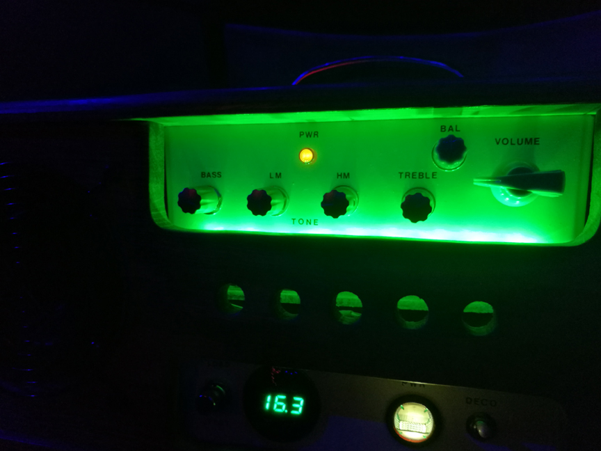 Here it is in the dark with the Deco lights (LEDs) on. The "16.3" is the battery voltage. When it gets down to 12.0, it's wise to turn the unit off until the batteries have been recharged.