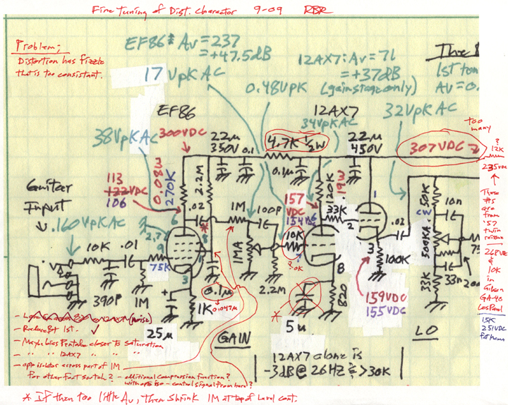 I started looking at circuits, and particularly at the headroom in the various stages of some known very good amps. I looked at the '57 Fender Twinamp that Eric Clapton has been using for the last decade, also the GA-40 Les Paul amp that sounded pretty darn good when I tried one once. Also my Fat Mama amp that is very similar to the "Octal Fatness" amp on the web (designed by Jim Morrossy I think). The good amps had between 235 volts and 265 volts feeding the 12AX7 distorter circuit. I had mine up at 307 volts. I figured that by reducing the B+ to just that section, I'd get a more gradual distortion with more apparent compression. I also wanted to make sure that clipping was dominated by saturation rather than cutoff, since I told that that would have "a more balsy sound". I made a copy of the part of the preamp circuit that I would be modding, and started brainstorming what should be looked at.