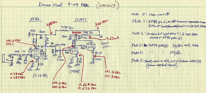 Photo 1, EF86 (JJ EF806S actually) front end pentode plate just starting to show visable distortion (vertical scale numbers are written on schematics) - all tests done at 1kHZ: