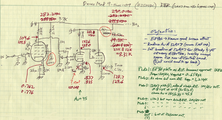 Well, after getting convinced that it was actually better sounding before the above mod, I decided to put the 12AX7 stage on an average of the B+ levels of the three best sounding amps (to my ear) that I know of. This time I not only changed the B+ to the 12AX7 stage, but cut in half the cap on the pentode screen grid to match my Fat Mama circuit, and deleated all together the cathode bypass cap on the 12AX7. I had more gain than I wanted, and by letting the front end do more of the gain, I'd have less hiss at the final output. Pulling that cap off the 12AX7 reduced its gain from about 70 to about 45, and I barely even noticed the difference when I went to play the guitar through it.