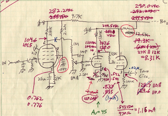 Rk - 470 ohm, no bypass cap, 33K driveing grid of follower, 250 volt B+, 110volt at plate of 1st triode running at 1.15 mA.