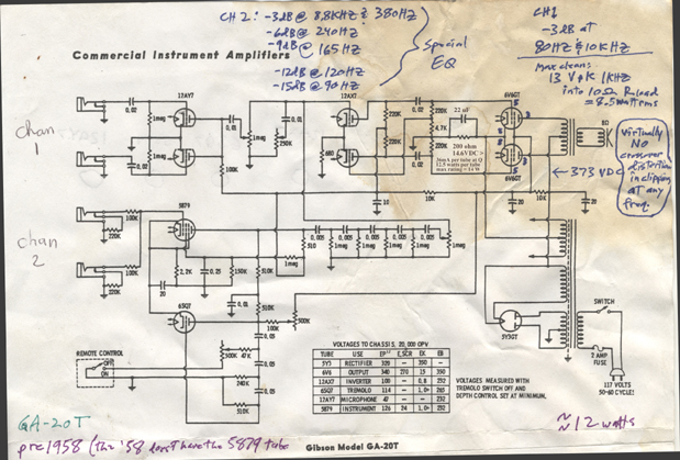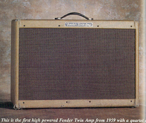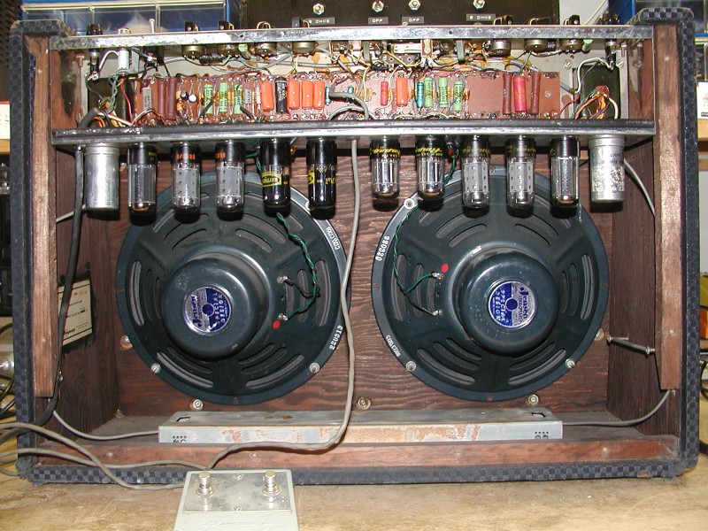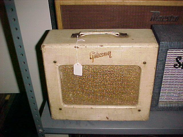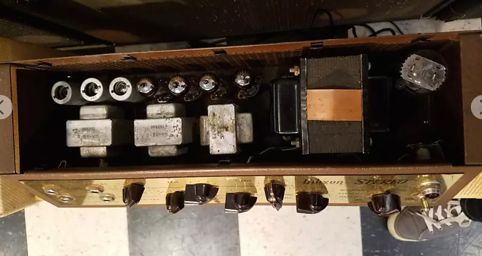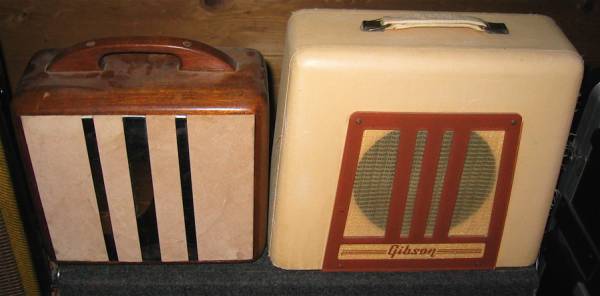 Second from the left is the 1956 Gibson GA-20t that has no blocking distortion making crossover distortion an issue. Second from the right is the 1959 Fender Twinamp. It put out 80 watts. Allegedly the first Fender amp to go beyond 40 watts.