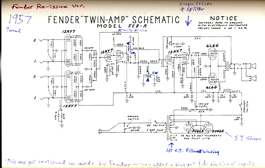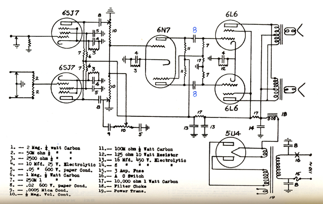 When you are running 10 tubes (as this amp does), you want to pay attention to the max current ratings of the filament windings of the power transformer. The often available 5VAC winding can be rectified and filtered, which will give you about 7VDC, which can be used with a dropping resistor to drive the filaments of the front end tube(s), if that makes better sense (I had to do this since the EL84 filaments are very thirsty). Running the first stage filaments on DC will reduce hum too.
