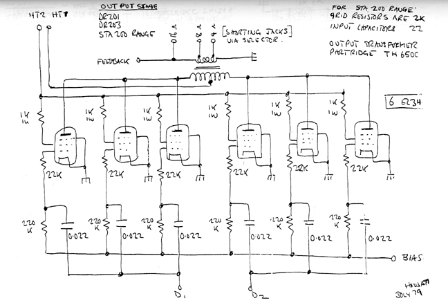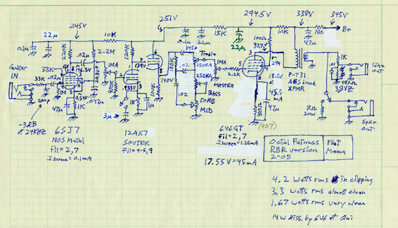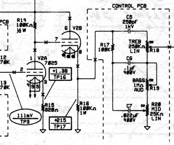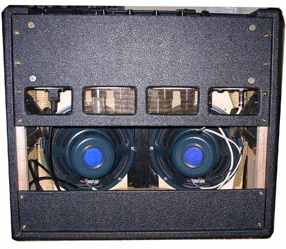 Negative Feedback and speaker damping. How the output stage interacts with the output transformer and reactive speaker load will have a substantial effect on the overall sound. Since this amp has no negative feedback, the speaker will be less tightly controlled; more free to resonate and contribute its own distortions. In Hi-Fi land this is ususally considered a bad thing. In guitar amps I find that it produces a warmer and more relaxed sound. If you want the bubbly breakup distortion in the low end, and a rich creamy sounding midrange and treble, no feedback will help that happen. Smaller speaker magnets help that as well, but at the expense of bass tightness. Those who always want clean and tight bass might want to use bigger speaker magnets and some negative feedback from the output back to the phase splitter stage, so the output Z of the amp is significantly lower, and thereby more able to tightly control the speaker reactance and resonance.