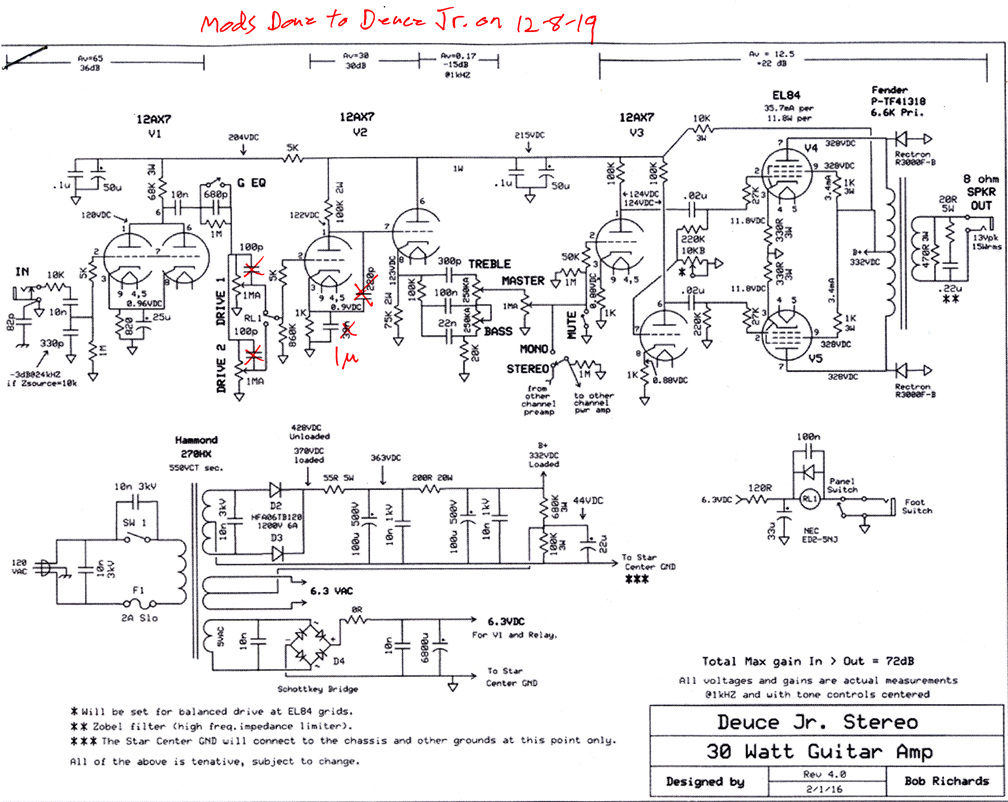 After using this amp in many jam sessions, I decided it had more treble than I wanted. It sounded too clean with a stratocaster. The 2019 Bluesman 20 watt amp I re-built after this one seems to have the perfect sound, so I decided to mod the EQ in this amp to match the EQ in the 2019 Bluesman amp. The mods are shown below in red.