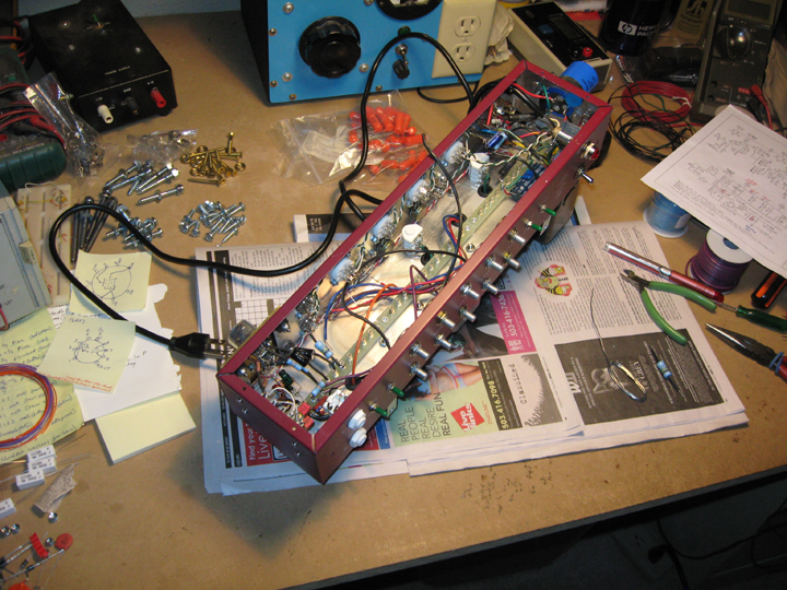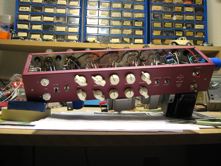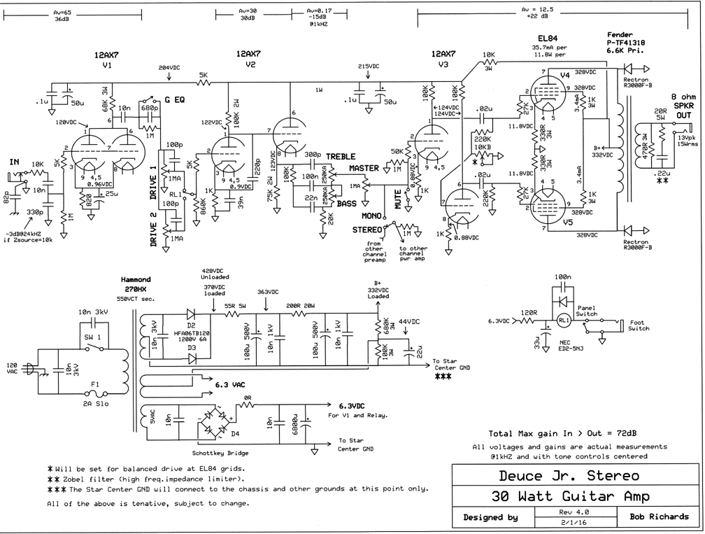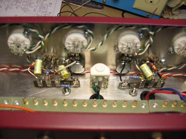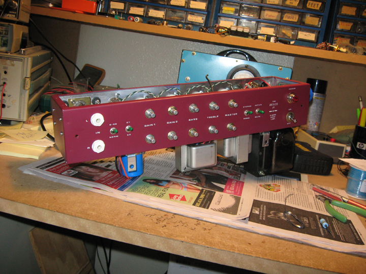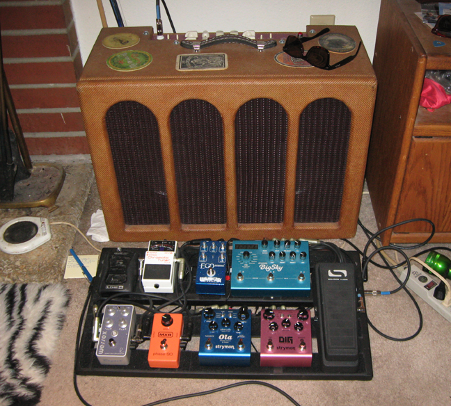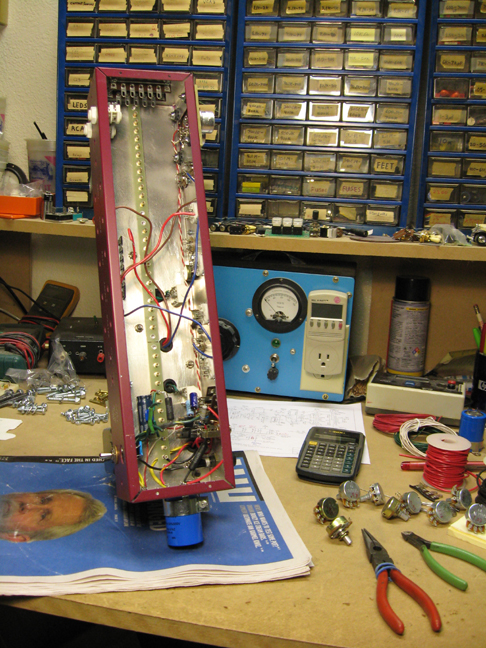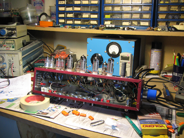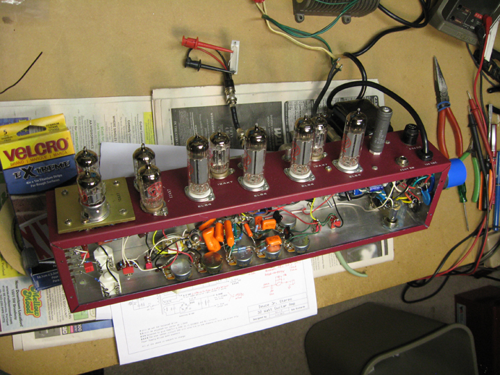 I've been designing and building Hi-Fi speakers, preamps, poweramps, signal processors, etc., since about 1970, mostly as a hobbyist at home in my lab but also while working in some high end professional engineering environments (Tektronix, Dolby Labs, a few AV companies, etc.) where the EE's encouraged me to pick their brains. I was employed as an Electronic Engineering Technician for most of 20 years before my current semi-retirement. I've been a guitarist since 1970, and have played many gigs in different types of venues in various bands. I try to play and sound like Eric Clapton; mostly bluesy, but plenty of clean digitally processed sound as well. These days I typically use compression, chorus, slap echo and reverb. The latter three pedals generate a stereo output from a mono or stereo input. Not much heavy metal. I play mostly electric but also acoustic guitars. In about 2001 a hard-core "tube-guru" friend of mine (Matt Kamna) who I met at Tektronix talked me into building something with tubes. Since then I've researched tube circuits very heavily for both hi-fi and guitar. I built one tube type Hi-Fi amp (The Musicbox project), and about 7 tube type guitar amps in the last 15 years. I was never interested in building an amp just so I could say I built it. It was always about building the amp I wanted to have, and couldn't find anywhere. So that's where I'm coming from in this vast and very subjective art.