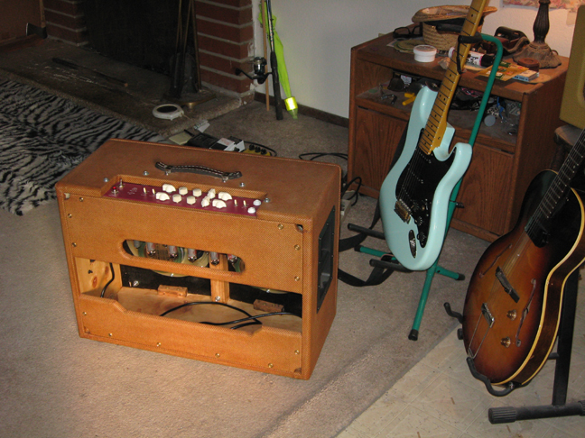 If I had it to do over again from scratch, I'm not sure I needed the footswitch for alternate gain. It seems like a useful feature, but I never actually use it. The guitar has a volume knob I use instead. Maybe replacing the alternate gain knob with a Mid tone knob would make better sense. I might try using 6V6 output tubes instead of EL84's, just to see if I can tell the difference. I'm not sure 6V6's would fit in this standard size Hammond chassis in this configuration though. I'd make the cabinet an inch less deep (like in the drawing). Oh, and those 1/4 phone jacks with the plastic nuts - they are a little flimsy and the nuts can loosen over time (they do on my pedalboard). I'd use metal nut jacks that also have isolated ground connections instead.