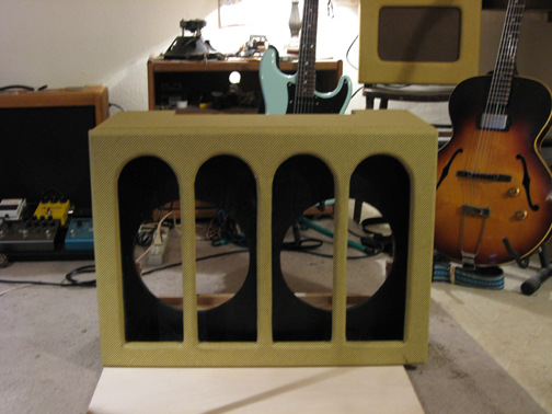 Gluing the tweed covering on and then staining it is probably my least favorite part of the process. Bad fumes, you need to wear gloves the whole time, and it can be messy. Same as with painting the chassis. You don't want to do any of that indoors, and it must be over 60 degrees F outside.