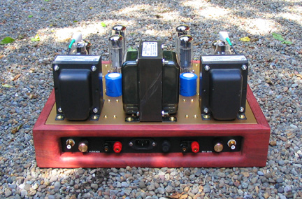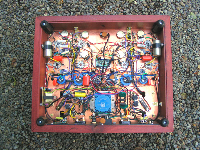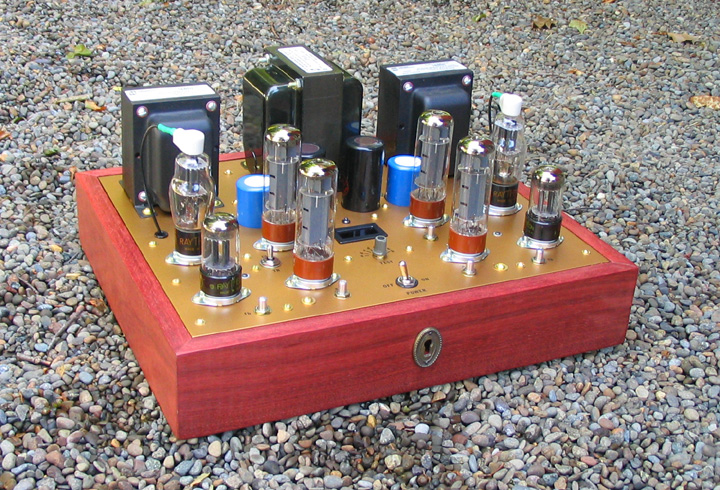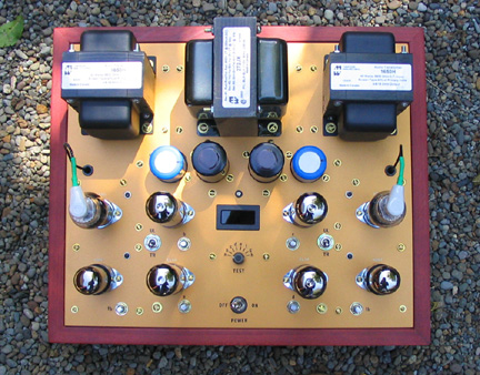 After researching, designing and building several guitar amps, and collaborating with Matt Kamna (one of the great "Tube Guru's" of our time), I felt I had really gotten inside what brings out the best in a tube, and in amplification in general. At that point, I felt compelled to design and build a truly excellent tube Hi-Fi amp. I looked at and anayzed dozens of different tube amp schematics that I found on the web. I played with many different topologies, crunching numbers, collaborating with Matt and learning the problems with each design as I went along. After sucking in all the info I could find, I asked my brain to come up with the ultimate version of something like a Dynaco Stereo 70 amp, that would be practical, affordable and have the magic of tubes in its sound signature. Here's what I came up with: