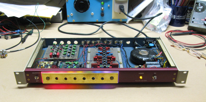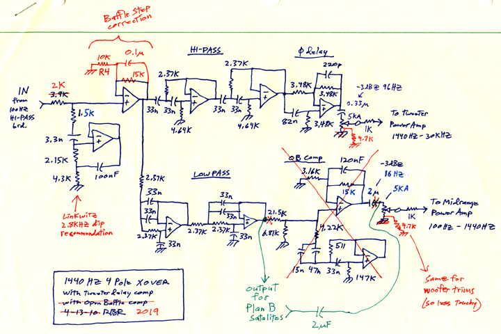 After deciding to part out my Aurium Waveguide speaker system (my living room is too small for that design), I decided to use the active crossover I had built for that system, on this system, since it would be easy to make the necessary modifications to the circuitry. I just bypassed the "open baffle EQ" circuits, and added some "Baffle Step" EQ, as shown in the schematic below, and now it's just what I want for the new system (this one).