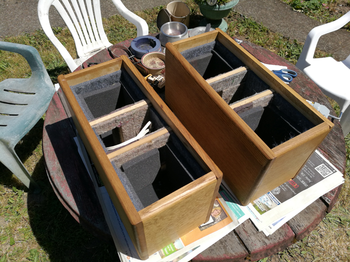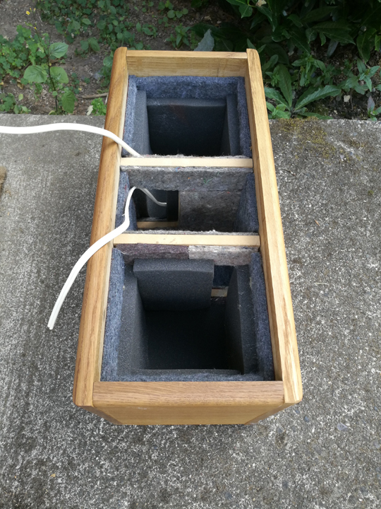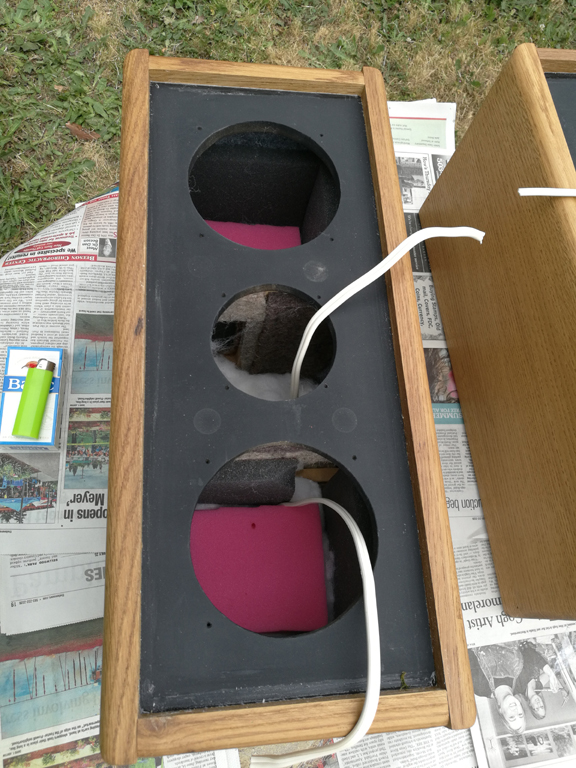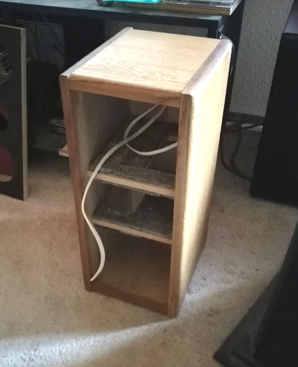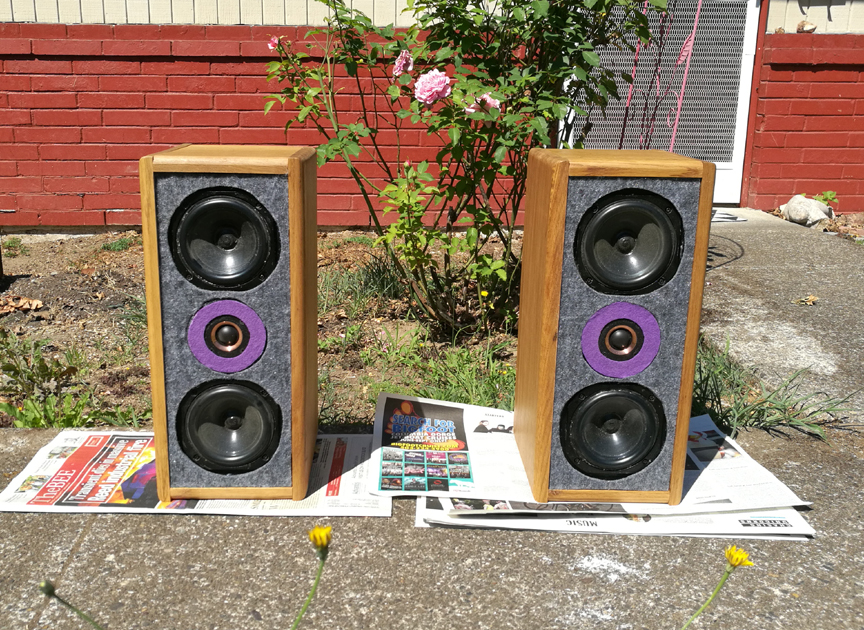 I love using white oak for cabinets, because it's beautiful, light colored, very heavy and very hard. It's therefore very hard for the acoustic energy inside the cabinet to re-emerge through the cabinet walls. I recessed the front 3/8 inch so I could glue 3/8 inch thick acoustically absorbtive felt to the front surface, to absorb what little emission there might be. There will still be "baffle step" effects, but you can't really get around those unless the drivers are mounted on a very big wall. the purple felt on the Seas Millenium tweeter drivers is thin regular felt. Treble is so directional, I doubt if that felt makes an audible difference, but I like how it looks.