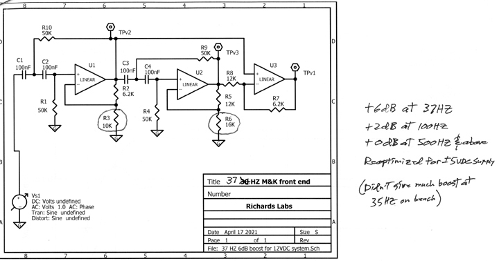 Having said that, the woofer active EQ circuit, as it turns out, needs a higher power supply voltage (didn't know until I bench tested it), because of how it does it's magic. Internal to the circuit, gain stages pump up the amplitudes before combining the signals at the output mixing function. So I had to reduce the gain in these stages, at the expense of how big of a boost I could get at 35HZ. The results are still good, just not quite AS good.