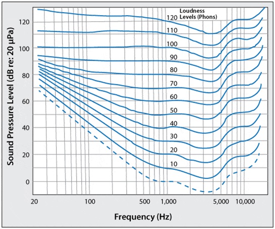 Typical listening levels in the home might be 70dB - 90dB ish. As can be seen in the graph above, at an 80dB average loudness level, bass below 200HZ, and treble above about 5kHZ will sound weak.