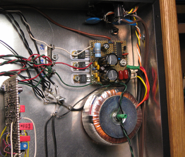 The power supply has the 7815 and 7915 regulator chips, and a 7805 for the relays which run on 5 volts. The timer circuit for the relays is built up on the back corner of the regulator board.