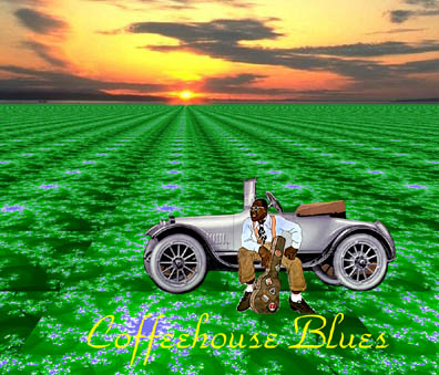 The landscape was created by running a fractile thru the KPT planar tiling filter. The car, the sky and the 'Bluesman' were cut out of existing graphics with my photoshop program, then dragged, dropped, adjusted for size, luminance and chrominance levels, and flattened with the landscape. |