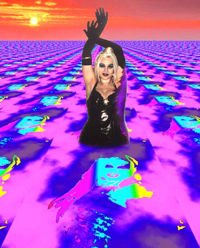 Elle was part of a group of actors and acresses who were doing burlesk inspired musicals on a small stage in a small theater that was built in the late 1800's.The head guy wanted me to make a poster from some photographs. I converted one picture of her into a two level black and white picture (no middletones). I filled that with a custom made gradient. I spun the hue wheel (so to speak) until I liked the hue position of the gradient colors after doing the fill. That went thru the KPT planar tiling for the landscape effect. I grabbed the sky from some other picture (cut> drag> drop), and made it all into a great little poster. |